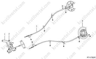 Схема привода стояночного тормоза. Механический трос идет от рычага в салоне к задним суппортам. Внутри заднего суппорта или барабана (в зависимости от конструкции конкретной партии) находится механизм, который разводит колодки или прижимает поршень.