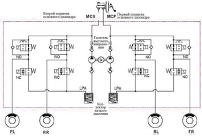 На этой схеме показано гидравлическое устройство системы ABS (антиблокировочной системы). Она демонстрирует, как давление от главного тормозного цилиндра (MCS/MCP) распределяется между передними (FL, FR) и задними (RL, RR) колесами через систему клапанов и насосов для предотвращения блокировки колес при экстренном торможении.